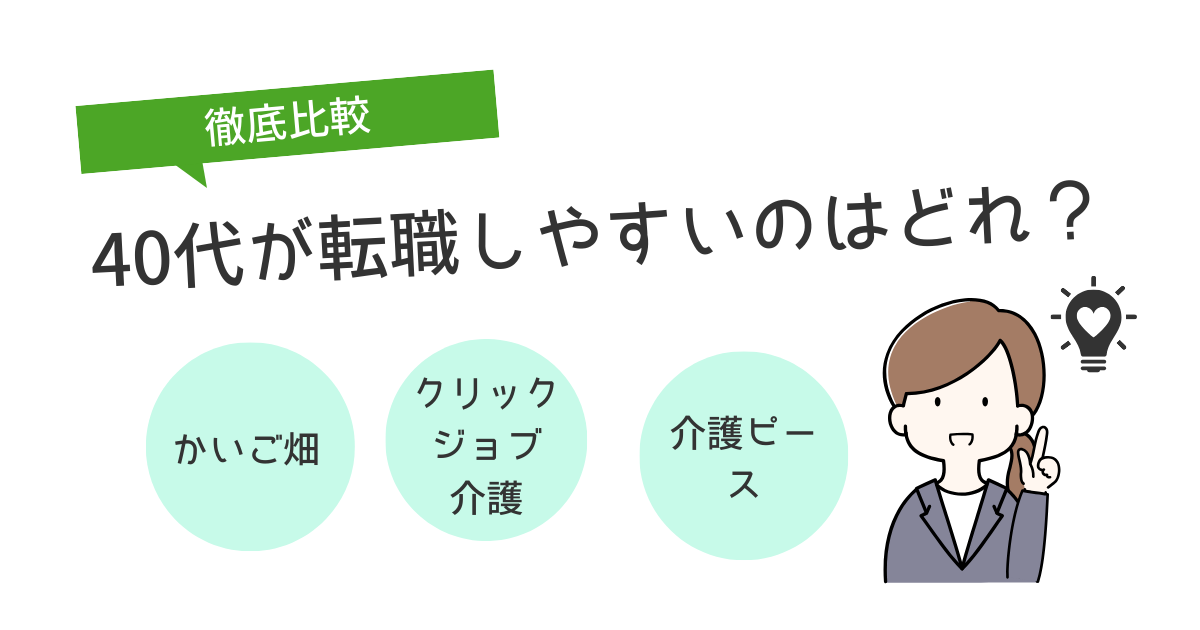 この記事では、介護の仕事を考えている40代の方に向けて、人気の介護転職サービス「かいご畑」「クリックジョブ介護」「介護ピース」の3社をわかりやすく比較しています。